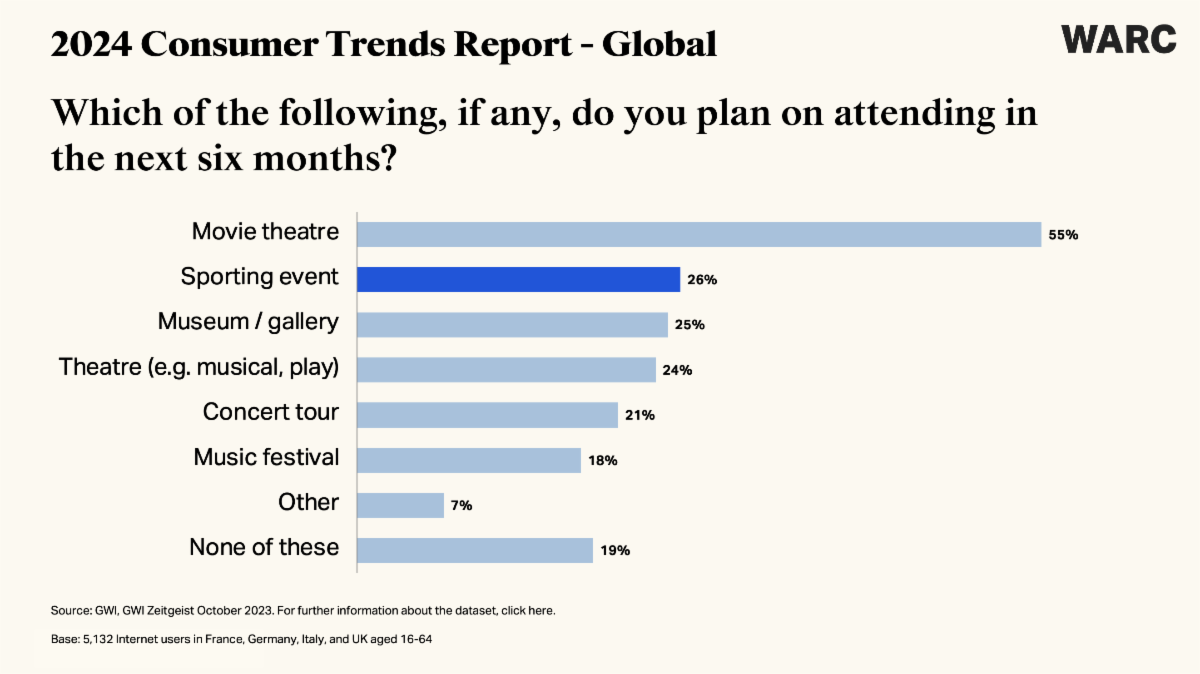 Live events also boost consumption across verticals. According to GWI data, two-thirds of consumers who attended a concert tour, music festival, or sporting event purchased food and beverages, and nearly half of concert-goers travelled for the event. Marketers can respond by ensuring a good fit in event partnerships to drive reach at scale, and explore ways to reach fans across different touch points beyond the event. Part of WARC’s Evolution of Marketing programme, complimentary sample reports of the 2024 Consumer Trends reports featuring global and regional insights are available here: Asia-Pacific, Europe, and North America. |