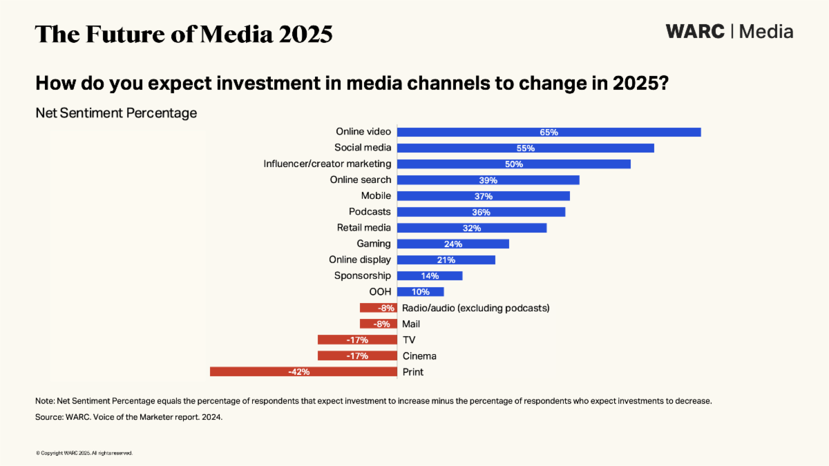Commerce is increasingly everywhere. Retail media is expanding, reaching $154.8bn in advertising spend globally in 2024 with a further 14.8% rise expected in 2025, per WARC Media. New commerce media platforms are launching, and social commerce is continuing to grow rapidly. Commerce media is becoming the infrastructure that underpins the entire digital advertising ecosystem, and offers brand building potential. Many retail and commerce media platforms now sell ads that allow advertisers to reach consumers across the purchase journey, from awareness all the way through to conversion. Advertisers will need to weigh up these opportunities carefully, supported by holistic measurement that allows them to show the impact of commerce on long-term brand and business metrics. New entrants may struggle to win spend from incumbents. Advertisers already admit to feeling overwhelmed by the number of options available in the commerce space and highlight a lack of standardisation across platforms as their biggest challenge with retailers. In the short-term, this may curtail the growth of new entrants as advertisers prioritise working with just a few large and established networks. Retail spending puts brand budgets at risk. Many advertisers appear to be divesting from traditional advertising channels to spend more on lower-funnel ads on retail media networks. Advertisers should protect traditional advertising budgets to avoid falling into a vicious cycle of weakening their brand, while raising the cost of driving performance on retail media properties. The Future of Media 2025 is based on data and insights from WARC, including WARC’s Marketer’s Toolkit global survey of 1000+ marketing executives, and external research. It is part of WARC’s Evolution of Marketing programme helping marketers address major industry shifts to drive effective marketing, and follows the recent publication of WARC’s The Voice of the Marketer 2025, The Marketer’s Toolkit 2025 and The GEISTE report. WARC members can read the full report. Complementing The Future of Media 2025 and associated reports, are a series of podcasts. |