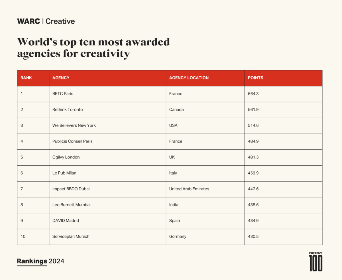 #1 Agency for creativity: BETC Paris After gradually climbing the Creative agencies ranking since 2019, BETC Paris have secured the top place for the first time. With three campaigns in the top 100, for Women in Games, Duolingo and Canal+, the Havas Creative Group agency accrued a winning margin of more than 100 points. Stéphane Xiberras, President & Chief Creative Officer, BETC Paris, said: “Being number one on The WARC Creative 100 is an incredible feat not to be taken for granted. Let’s take the time to reflect on that accomplishment and thank all our collaborators, clients, and partners that helped us make it happen. It’s a testament to the creative excellence that we’ve kept year after year.” Independent agency Rethink Toronto has risen to second place, up from 17th last year, with three campaigns ranked in the top 100 – two for Heinz and one for Penguin Random House. We Believers New York, takes third place, up from 8th in 2023 with two campaigns highly ranked for Corona. #1 Network for creativity: Ogilvy Ogilvy was the most awarded network for the fourth year in a row, with 37 offices contributing to its total and 9 in the top 50, including five DAVID offices. The network was also responsible for 12 of the top 100 campaigns this year. Liz Taylor, Global Chief Creative Officer, Ogilvy, said: “Ranking as the most creative network on the Creative 100 for the fourth year reflects our deep belief that creativity is the ultimate differentiator and force multiplier. It’s an outcome only earned because of the hard work, brilliance, and fearlessness of everyone at Ogilvy and our brave clients around the world. We are filled with gratitude and pride for the impact we have been able to create together this year.” DDB Worldwide retained its 2nd position with 6 agencies in the top 50 and 7 campaigns in the top 100. Having rebranded from VMLY&R and merged with Wunderman Thompson, newly created VML enters the ranking in 3rd place. #1 Holding Company for creativity: WPP WPP maintained its position at the top of the holding company ranking with three networks in the top 50, including 1st and 3rd ranked networks, Ogilvy and VML. Rob Reilly, Global Chief Creative Officer, WPP, said: “Awards are the by-product, never the motivation, of doing the boldest and most effective work for our clients. To be recognised as the most creative company in the world for the second year in a row, is down to the relationships our brilliant agencies have with our brave brand partners and our production co-conspirators.” #1 Brand for creativity: Burger King For the sixth year in a row, Burger King tops the brand ranking for creativity. Despite only having one campaign in the top 100 (Burger Glitch), the quick-service restaurant had 26 awarded campaigns in the full data set. Sabrina Ferretti, Marketing VP, Burger King International and Pat O’Toole, Chief Marketing Officer Burger King US & Canada, said: “We’re incredibly humbled to be named the most creative brand in the world by WARC again this year – wow! This recognition is driven by unforgettable creativity always rooted in consumer and cultural tensions that deliver business results and continued brand strength. This top spot for the past six years is a testament to the work of our passionate Franchisees, creative agencies and internal teams, all of whom make up our global Burger King family.” Corona, is in second place with 11 campaigns in the full data, and McDonald’s, which last ranked in 2022 is in third, with 25 campaigns across the full listing. #1 Advertiser for creativity: Anheuser-Busch InBev For the third year running, AB InBev tops the advertiser ranking. The alcoholic drinks brand owner had seven campaigns in the top 100 creative campaigns, and four brands in the top 50 brands ranking. Marcel Marcondes, Chief Marketing Officer, AB InBev, said: “At AB InBev we use creativity to find solutions to consumer problems and drive organic growth. It’s an important part of our culture and we’re humbled to be ranked number one in the WARC Creative 100 for the third year in a row. We also couldn’t be prouder to have Corona recognized as the highest-ranking beer brand on the list.” Unilever retains its 2nd place for the 2nd year running with two brands – Dove and Vaseline – ranked in the top 50. Apple moves up to 3rd position, up from 6th the previous year. #1 Country for creativity: USA The USA retains its 1st place as the most awarded country for creativity – a rank it has held since 2006 (when the Creative 100 was the Gunn Report). However, for the first time in 10 years, the UK has dropped out of 2nd place, beaten by France by a small margin of points. The top ten most highly ranked campaigns and companies in the WARC Rankings Creative 100 2024 are: |