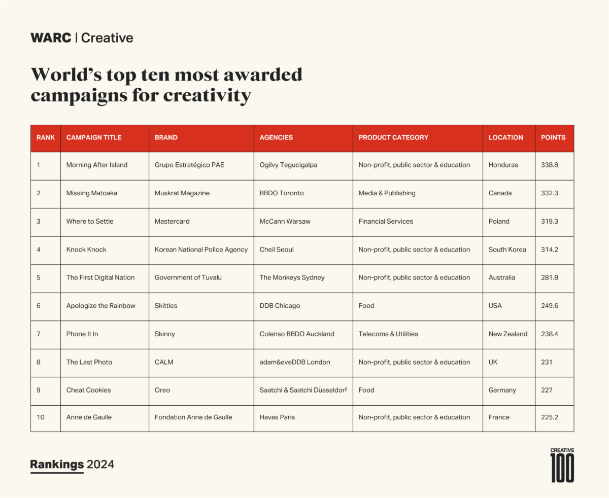 The WARC Creative 100, the ultimate independent global benchmark of the world’s most awarded campaigns and companies for creative excellence, is now released. Compiled by WARC Creative, helping companies deliver creative marketing that works, the annual Creative 100 Ranking reflects the work that was awarded by the most important global and regional creative shows in 2023. The awards tracked are determined by a yearly global panel survey and in consultation with the WARC Rankings Advisory Board. Amy Rodgers, Head of Content, WARC Creative, said: The WARC Creative 100 are league tables of the best of the best campaigns and the companies behind and for them. They provide the ideal opportunity for the industry to reflect and be inspired by the great body of work produced and how creativity is a driver, not only of differentiation, but for change. “The creative use of digital technology is prevalent in this year’s Creative 100, used in ‘The First Digital Nation’ for Government Of Tuvalu, ‘McEnroe vs McEnroe’ for Michelob Ultra, and ‘Backup Ukraine’ for Polycam / UNESCO among others. And women’s rights were a dominant purpose for many of the campaigns at the top of the Ranking, such as the #1 ranked campaign ‘Morning After Island’ and ‘Knock Knock Knock’, ranked 4th, for the Korean National Police Agency”. #1 Campaign for creativity: Morning After Island by Ogilvy Tegucigalpa for Grupo Estratégico PAE The most creatively celebrated campaign of 2023 was ‘Morning After Island’ for Honduran non-governmental organisation Grupo Estratégico PAE. Ogilvy Tegucigalpa created a physical activation and social media campaign to overturn a national ban on emergency contraception. Liz Taylor, Global Chief Creative Officer, Ogilvy, said: “Seeing ‘Morning After Island’ rank as the most awarded creative campaign of the year, is a testament to the resilience of our team in Honduras and proof that creativity has no bounds. Creativity can drive business, shape culture, and impact policy – in this case it helped millions of Honduran women change the law so they can legally take the morning-after pill. It is an idea that continues to inspire us all.” In second place is ‘Missing Matoaka’ by BBDO Toronto for Indigenous arts and culture magazine Muskrat that reveals the true story of Pocahontas. In third, ‘Where to Settle’ by McCann Warsaw for Mastercard, launched a digital platform to help Ukrainians find places of refuge outside big cities.